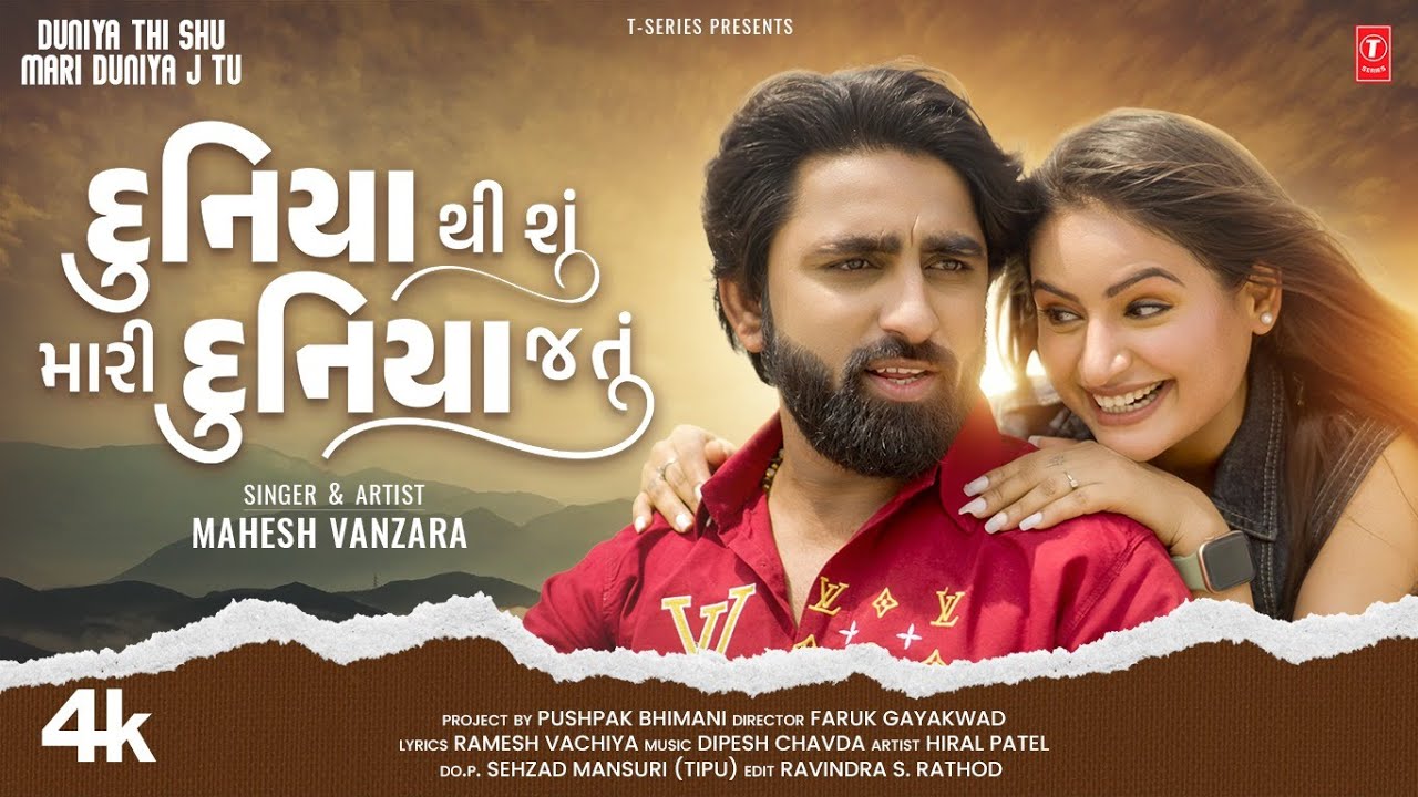 LYRICS OF DUNIYA THI SHU MARI DUNIYA J TU IN GUJARATI: દુનિયાથી શું મારી દુનિયા જ તું, The song is sung by Mahesh Vanzara from T-Series Gujarati. "DUNIYA THI SHU MARI DUNIYA J TU" is a Gujarati Love song, composed by Dipesh Chavda, with lyrics written by Ramesh Vachiya. The music video of the track is picturised on Hiral Patel, Adil Shaikh, Sanjay Raval, Urmilaben Raval and Bharatbhai.